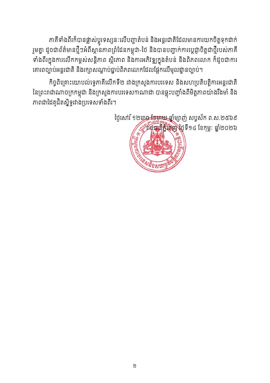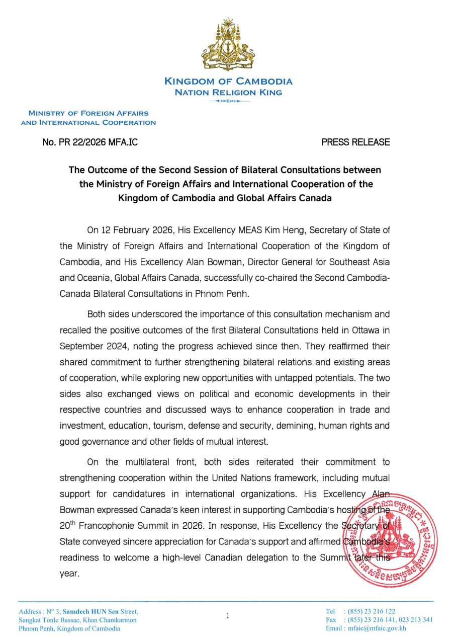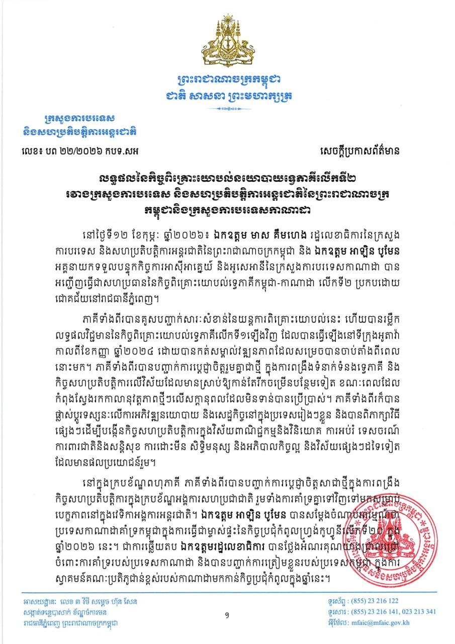 ភ្នំពេញ៖ កិច្ចពិគ្រោះយោបល់នយោបាយទ្វេភាគីលើកទី២ រវាងក្រសួងការបរទេស និងសហប្រតិបត្តិការអន្តរជាតិនៃព្រះរាជាណាចក្រកម្ពុជា និង ក្រសួងការបរទេសកាណាដា ត្រូវបានប្រារព្ធឡើងដោយជោគជ័យ កាលពីថ្ងៃទី១២ ខែកុម្ភៈ ឆ្នាំ២០២៦ កន្លងមកនេះ នៅរាជធានីភ្នំពេញ ដោយមាន លោក មាស គឹមហេង រដ្ឋលេខាធិការ និង លោក អាឡិន បូមែន អគ្គនាយកទទួលបន្ទុកកិច្ចការអាស៊ីអាគ្នេយ៍ និងអូសេអានី ជាសហប្រធាន។